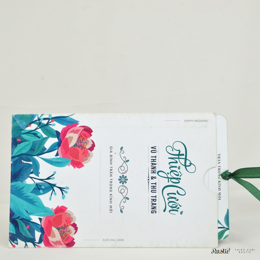 ? Gồm 01 phong bì dọc 13x20cm và 01 thiệp đơn ở trong in 2 mặt 12x19cm. Thiệp đơn đục lỗ, gắn ruy băng, bo tròn 4 góc tùy mẫu.