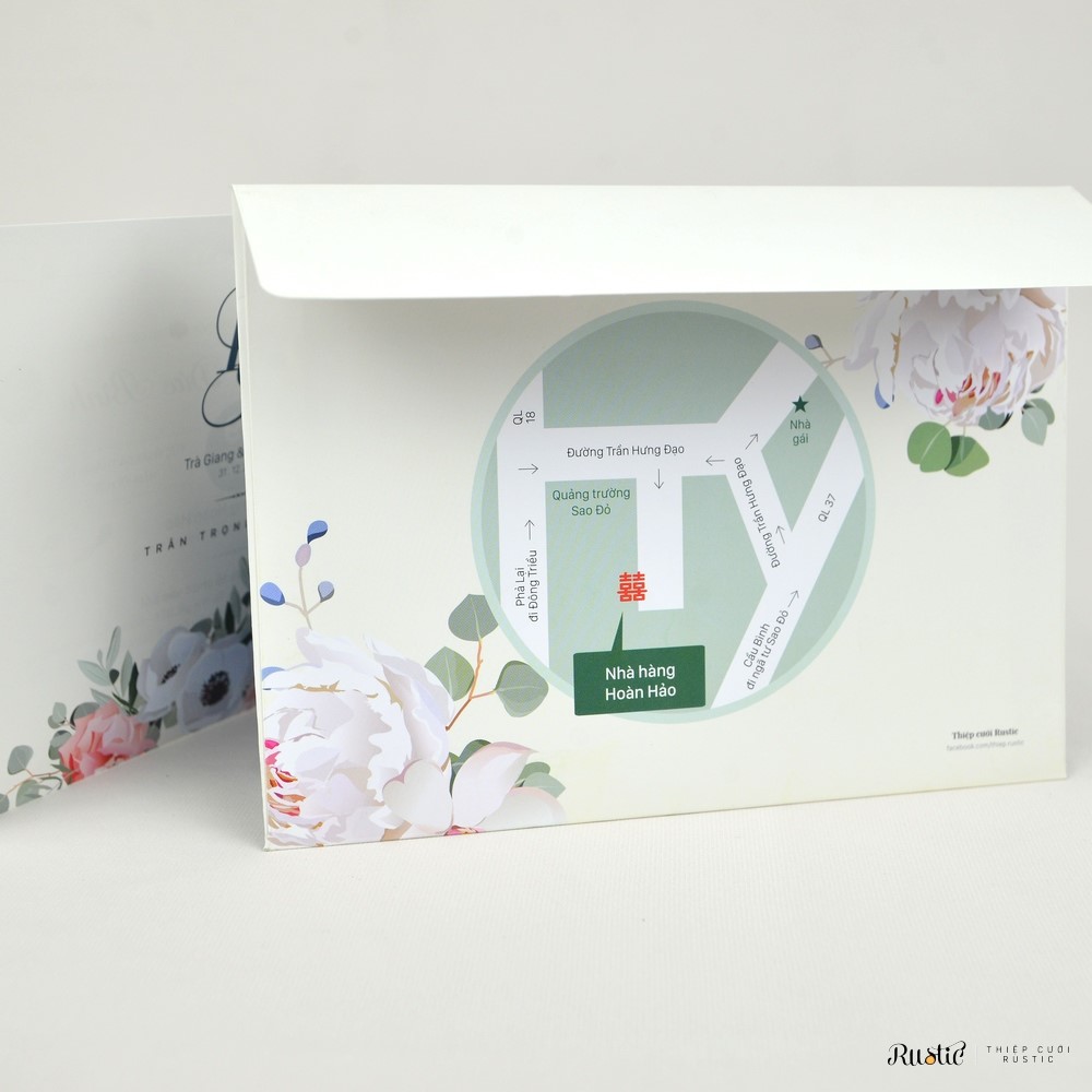 ? Gồm 01 phong bì ngang 19x14cm và 01 thiệp đơn ở trong in 2 mặt 13x18cm. Thiệp đơn bo tròn 4 góc tùy mẫu.