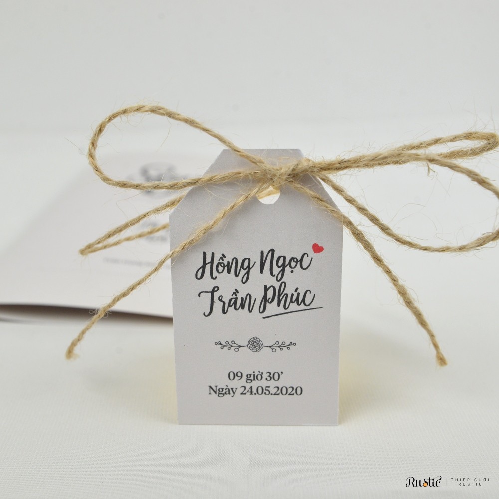 ? Tag là 4.5×7.7cm, in 2 mặt, kèm dây thừng buộc quanh